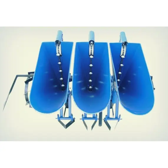 - В устройстве чеснокосажалки 3-х рядной на мотоблок (ЧС11) с ложками диаметром 34 мм имеются 3 бункера под зубцы. Емкость каждого резервуара составляет 10 литров. Поэтому частые технические паузы на дозаправку бункеров делать не придется.