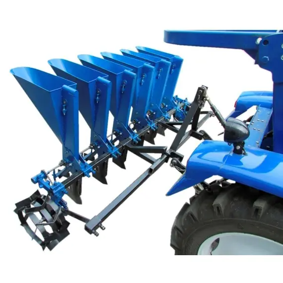Чеснокосажалка 6-и рядная с двойной ложкой на минитрактор (ЧС26) ложки Ø34, Ø24,5 — эффективное навесное орудие, предназначенное для ускоренного выполнения посевных работ на полях большой площади. Для агрегатирования подходят минитрактора большой мощности — минимум от 24 л.с. Сцепка осуществляется за счет 3-позиционного узла крепления с гидроподъемом орудия. Грунт рекомендуется предварительно подготовить к посевными работам, чтобы обеспечить легкую проходимость тяговой техники с навесным оборудованием и равномерный высев посадочного материала.