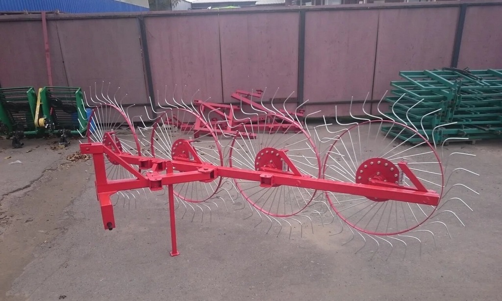 Грабли колесно-пальцевые «Солнышко» на 4 колеса – это навесное оборудование для трактора от 22 до 24 л.с. Используется для ворошения скошенной травы при сушке ее на сено в полевых условиях, сгребания сухого сена в продольные валки, а также для сгребания соломы после уборки зерновых.