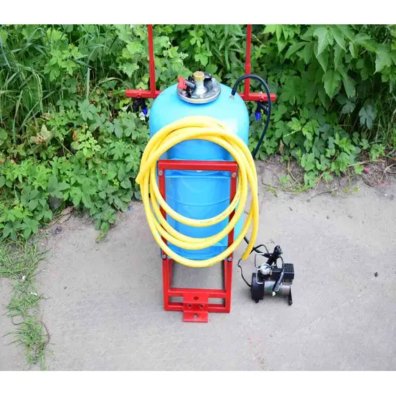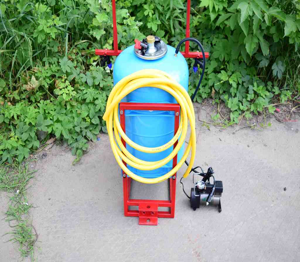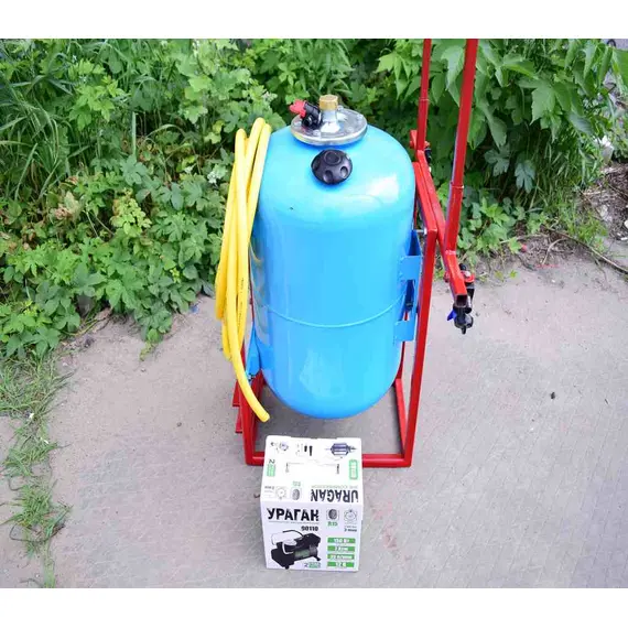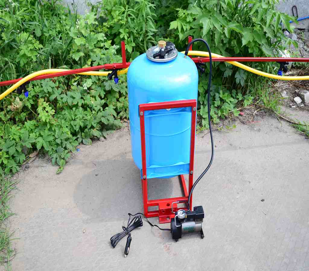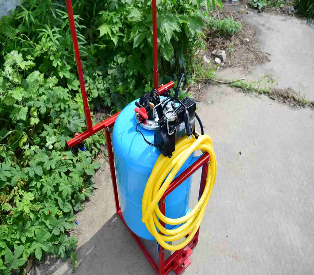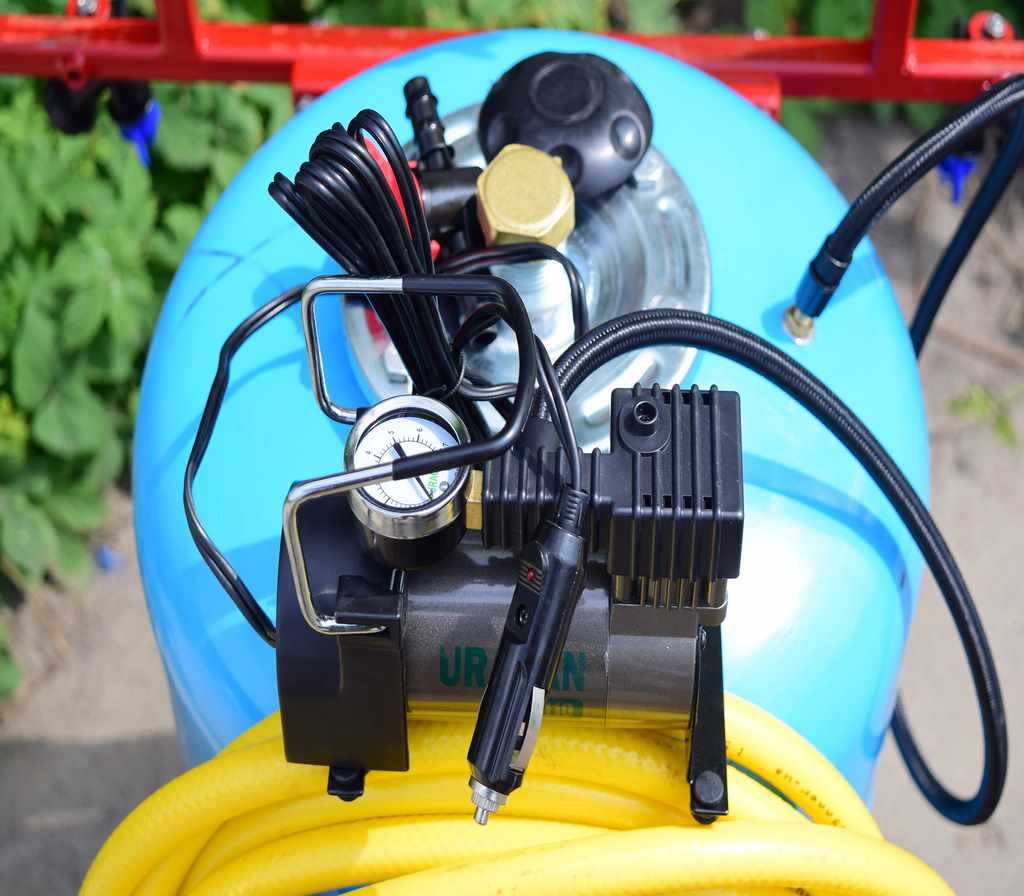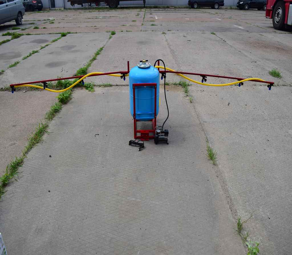 Давление создается компрессором, который подключается либо к аккумулятору на мототракторе или же можно установить аккумулятор на раме опрыскивателя - крепление для этого есть.