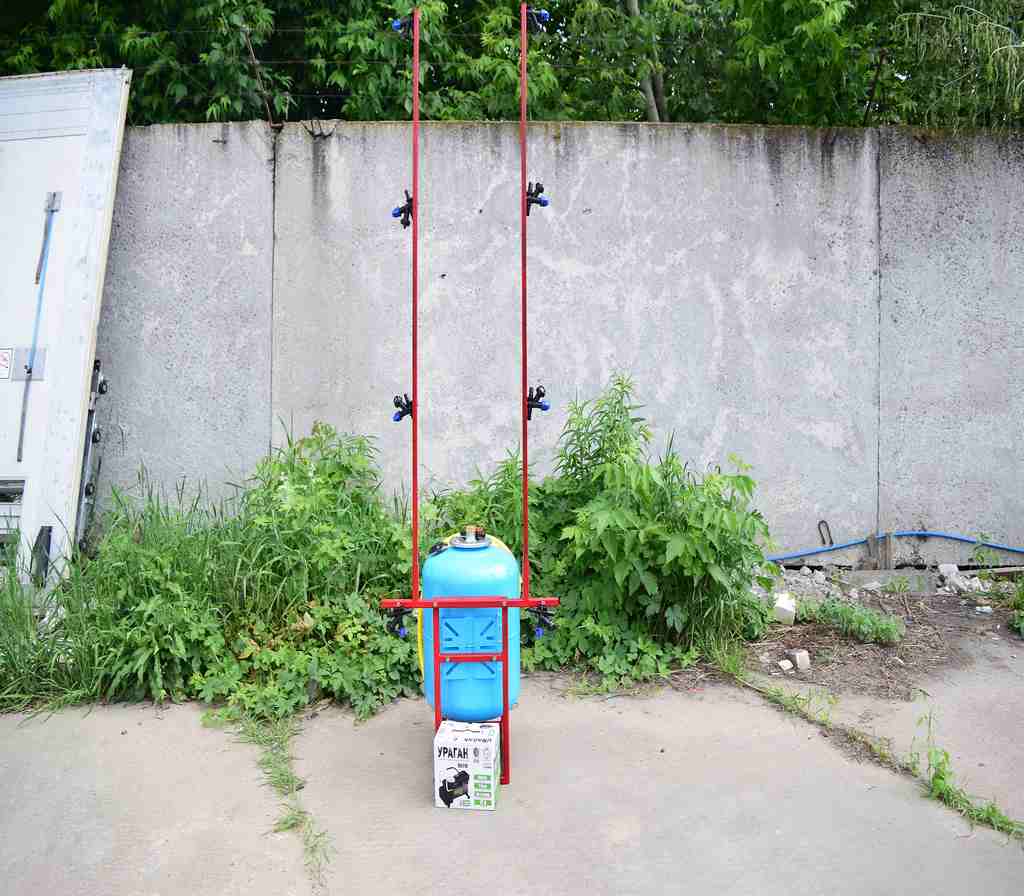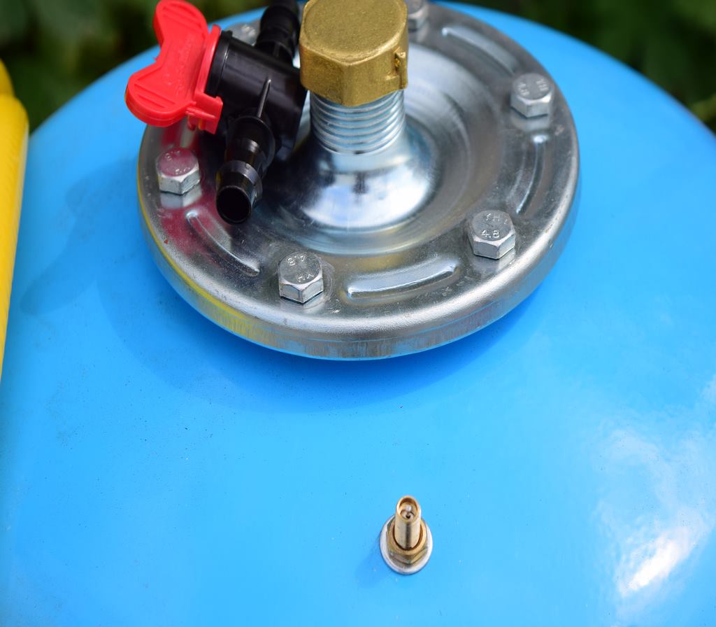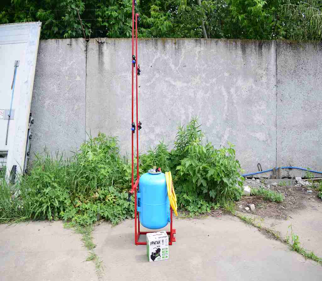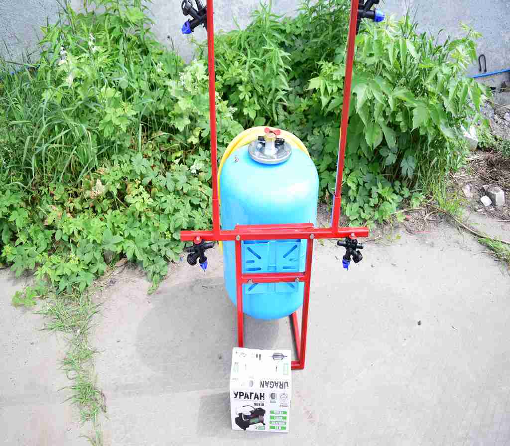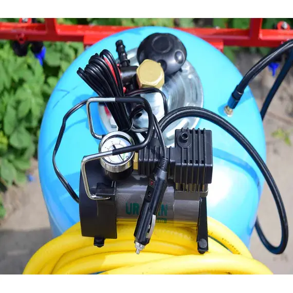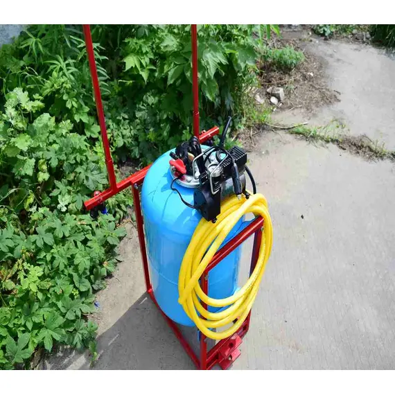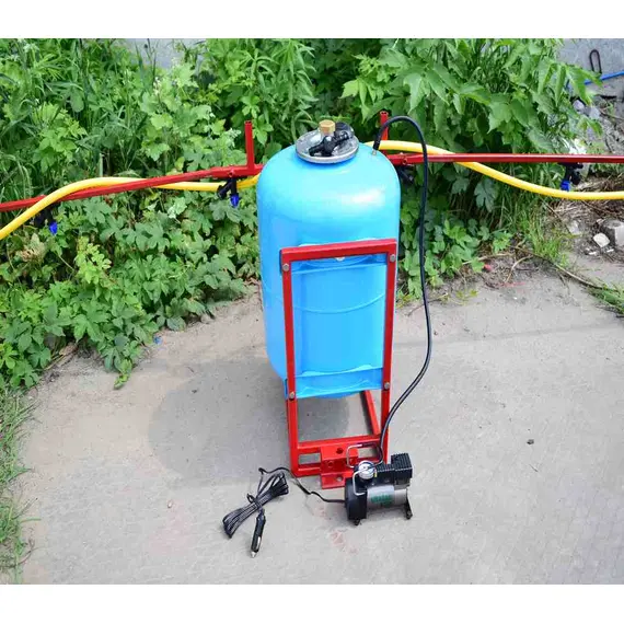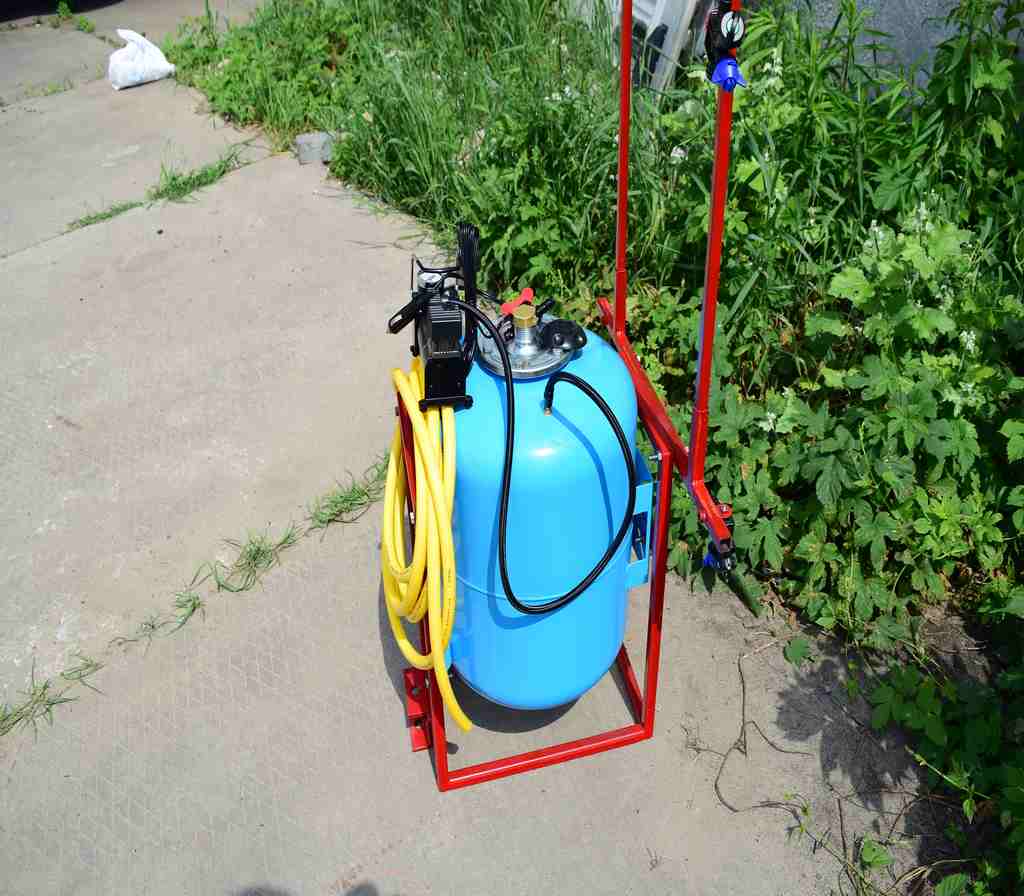 Давление создается компрессором, который подключается либо к аккумулятору на мототракторе или же можно установить аккумулятор на раме опрыскивателя - крепление для этого есть.