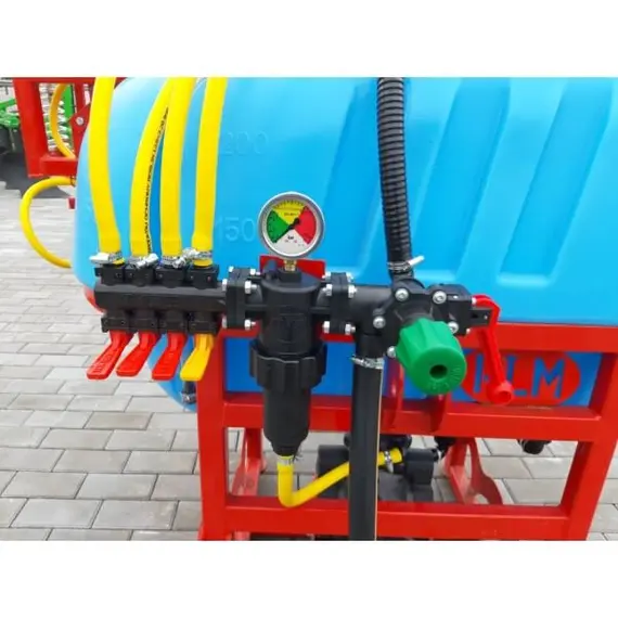 Под рамой располагаются предохранительные дуги, не дающие конструкции касаться почвы и уравновешивающий механизм из амортизатора, гидравлического корректора высоты подъёма – от 50 до 150 см, который позволяет удерживать штангу длиной 8 метров в горизонтальном положении при работе на склонах. Принцип работы опрыскивателя навесного Ярмет 200 литров прост – жидкость насосом перекачивается на 16 форсунок с боковым отсекателем. Водитель наблюдает за процессом опрыскивания из кабины трактора, устанавливает оптимальное давление в системе – от 1,5 до 6 Бар.