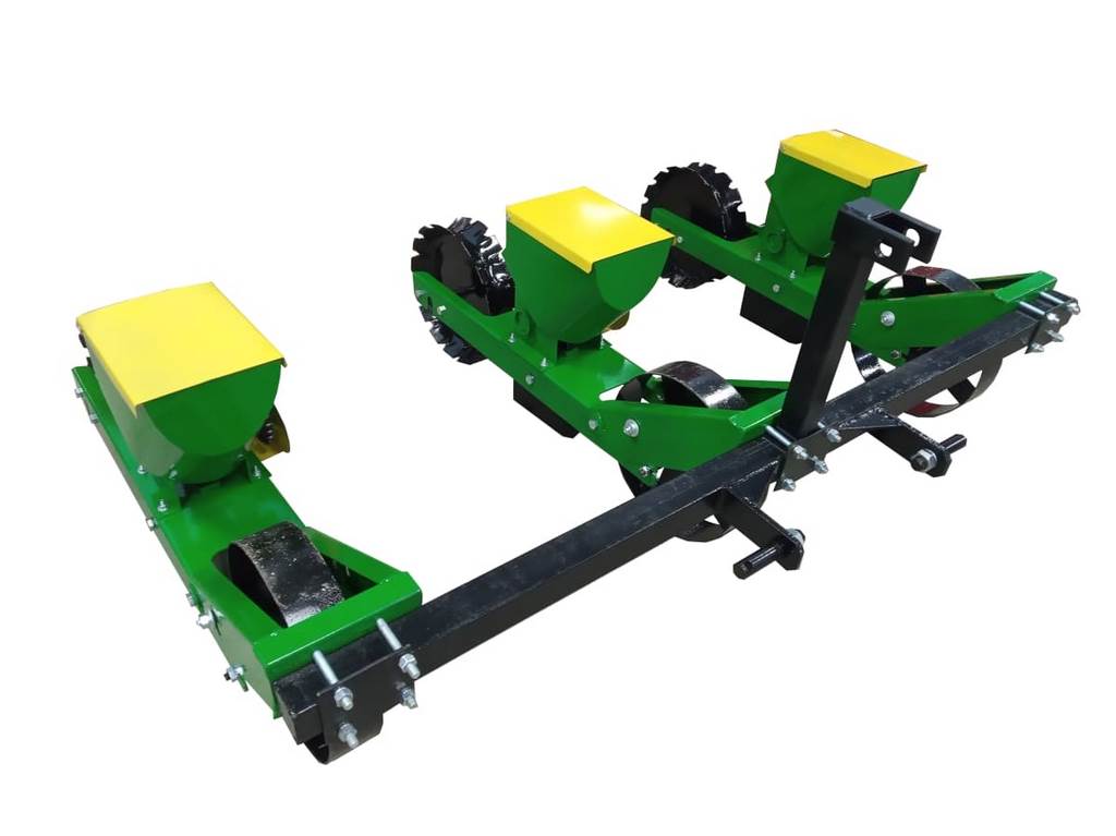 Сеялка трехрядная СМ-3 (3-х точечная) навесного типа агрегатирутся к мото и минитракторам, с шириной междурадье от 30 до 70 см. Шаг высадки составляет 10 см, а объем бункера 15 л.